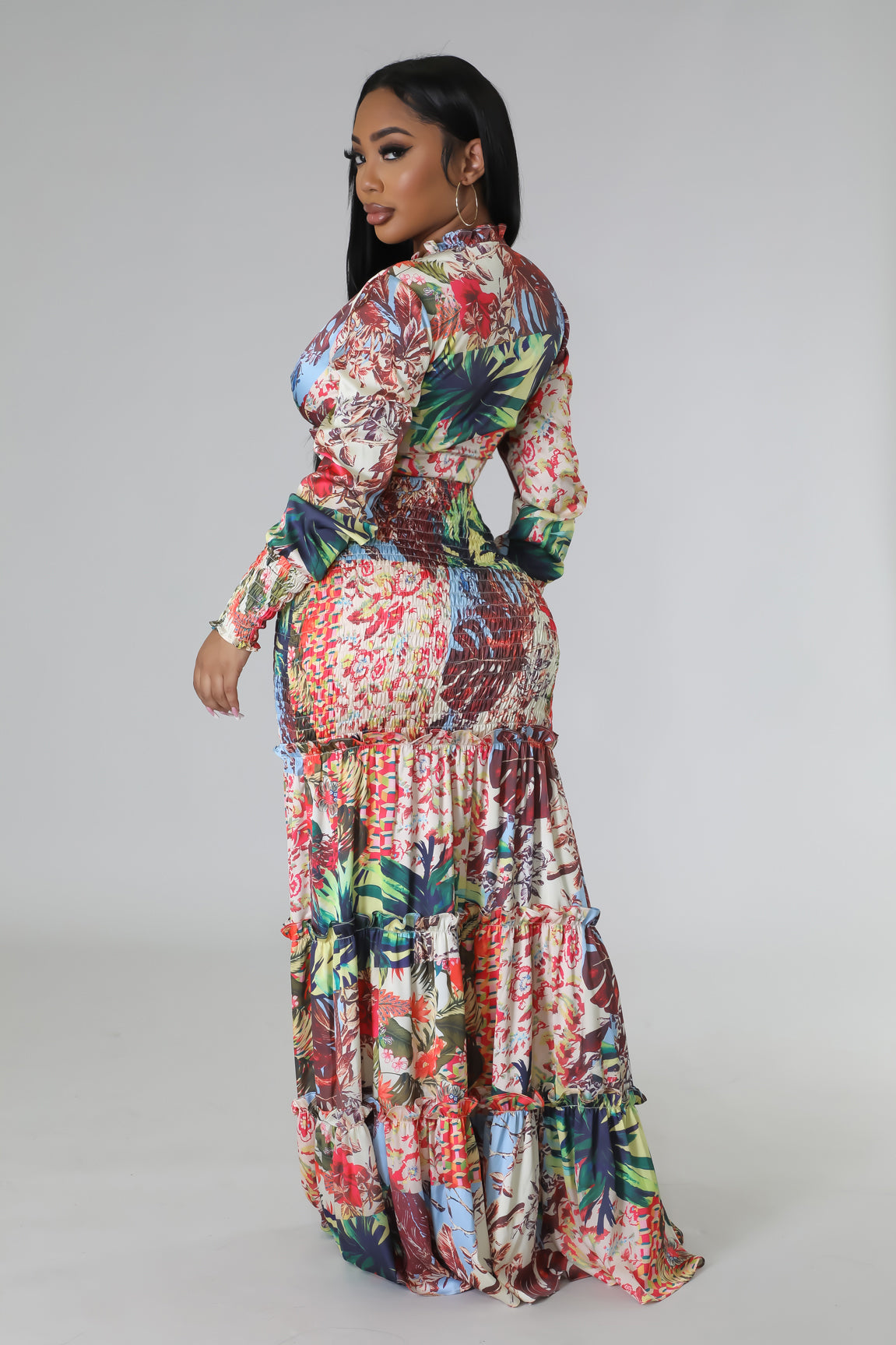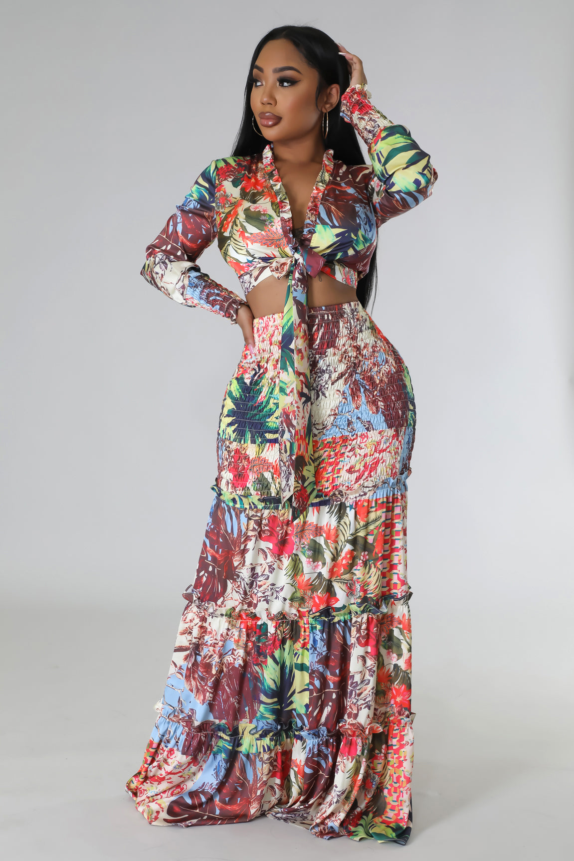 Ensemble jupe longue et top multicolore à manche longue satiné