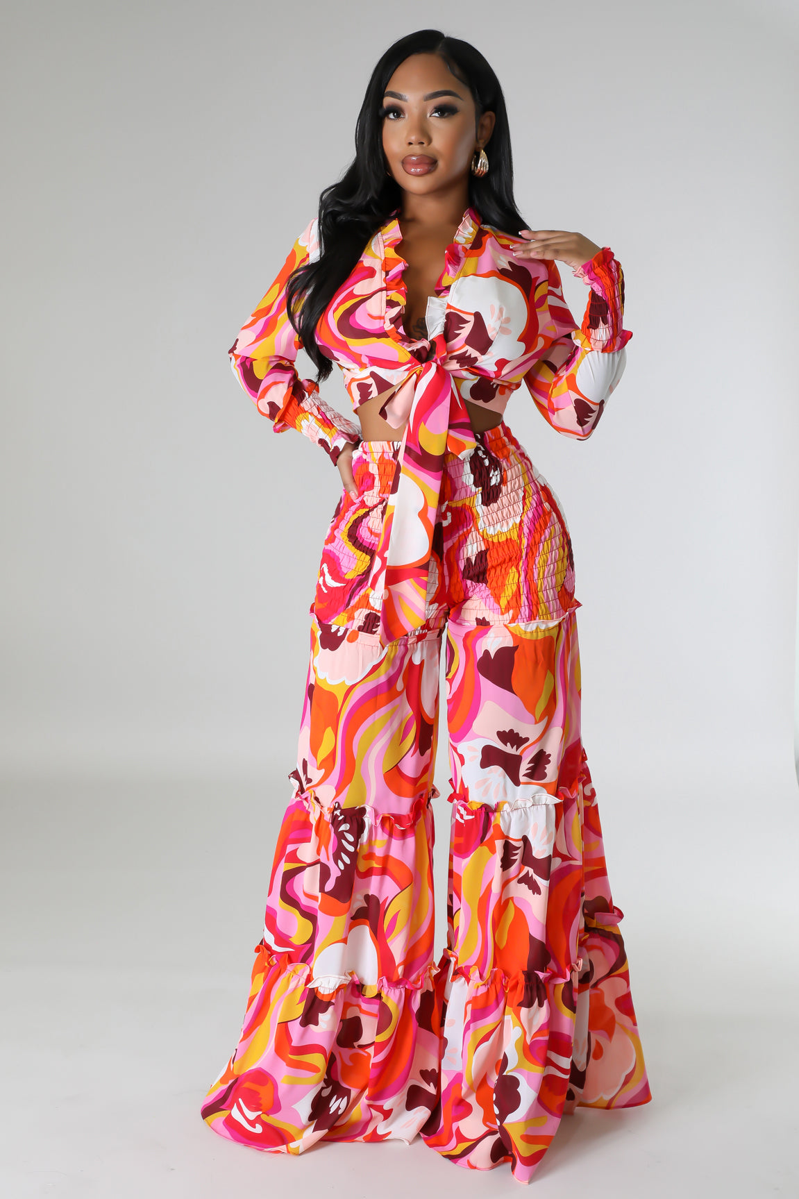 Ensemble 2 pièces Froufrous pantalon large taille haute et top à manche longue