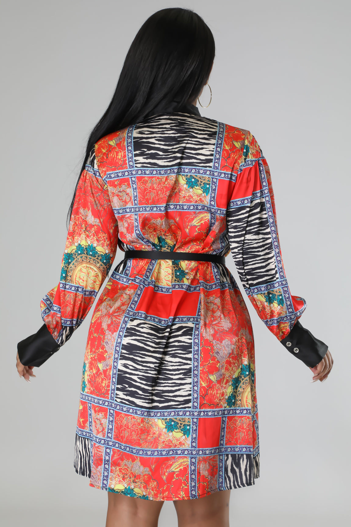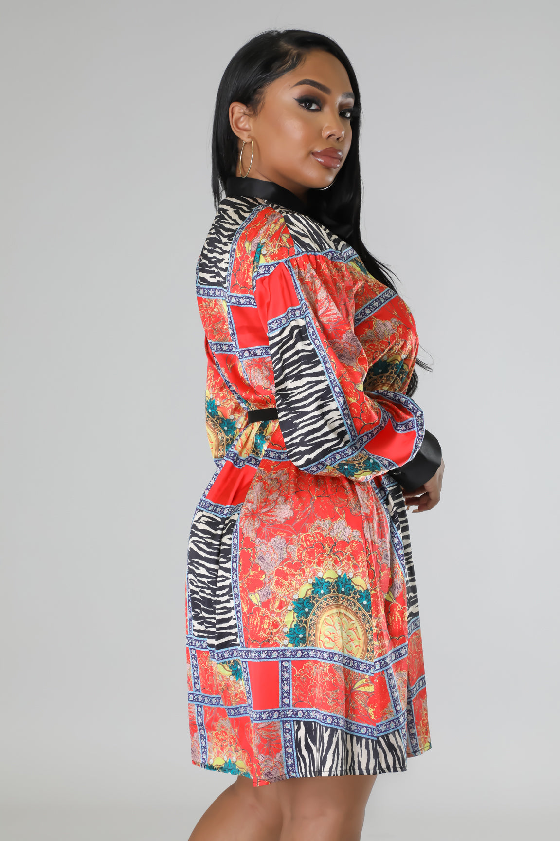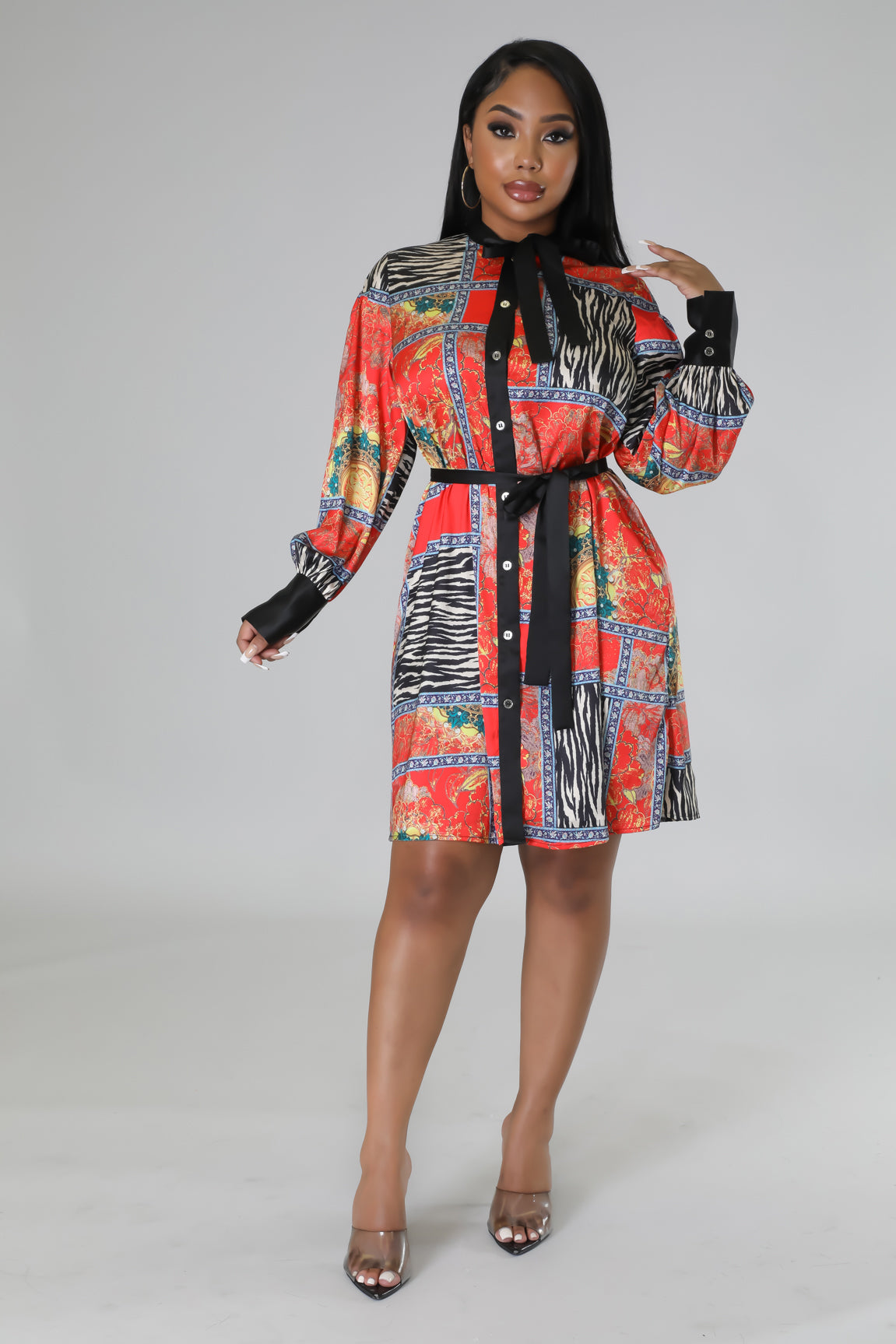 Maison Robe courte satinée à manche longue multicolore auto-cravate
